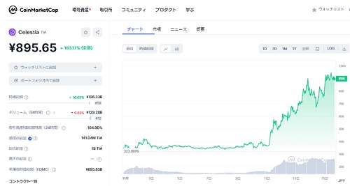 セレスティア(Celestia/TIA)の最高値は、2023年11月15日に記録した約946.91円です。coinmarketcap調べ。
