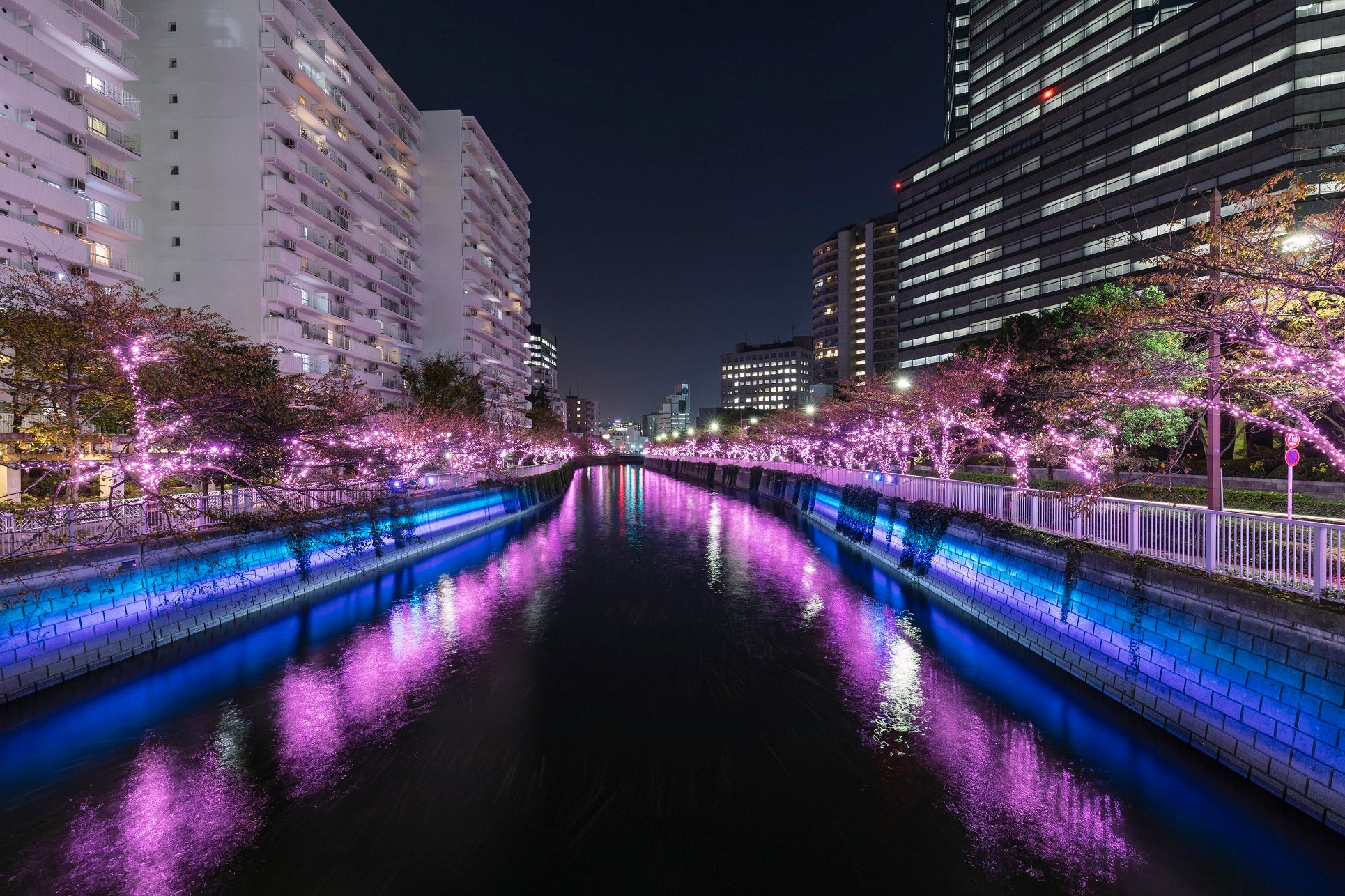 目黒川沿いの桜が発電量の少ないLEDライトで装飾され、冬にも咲き光ります。